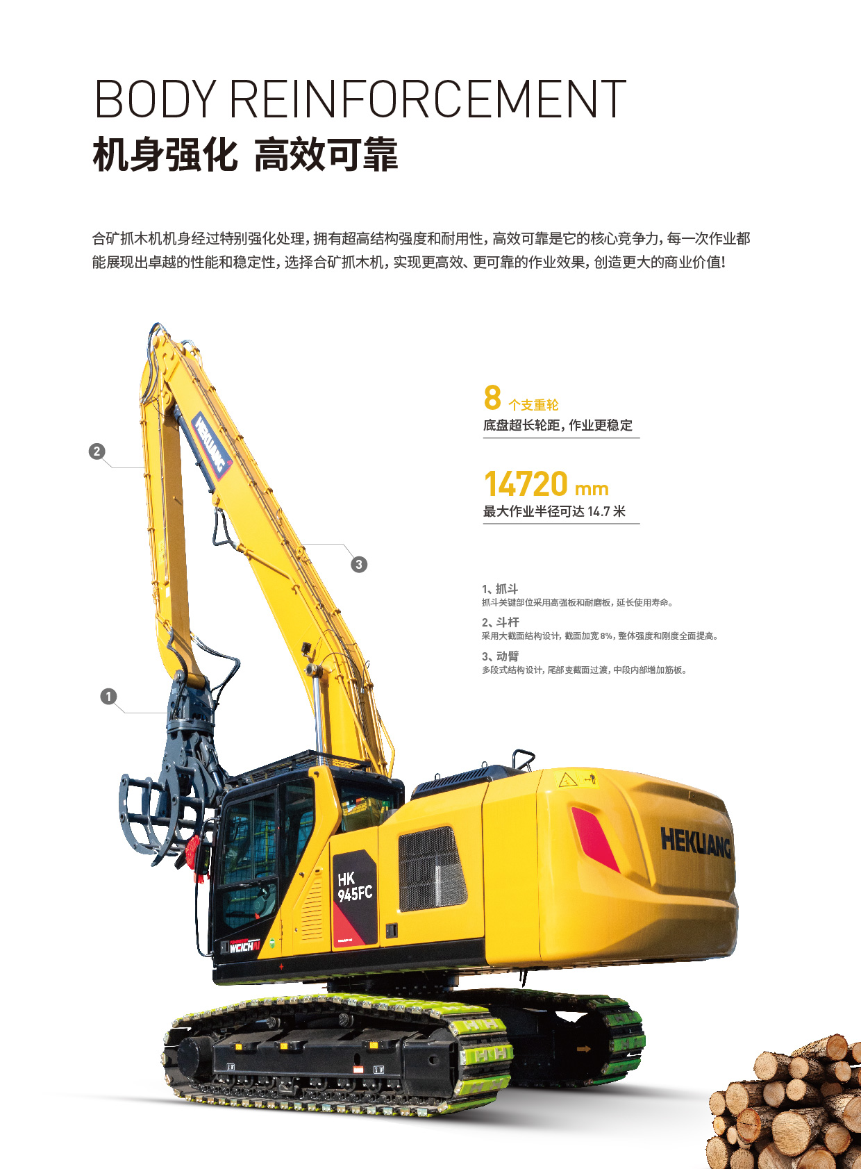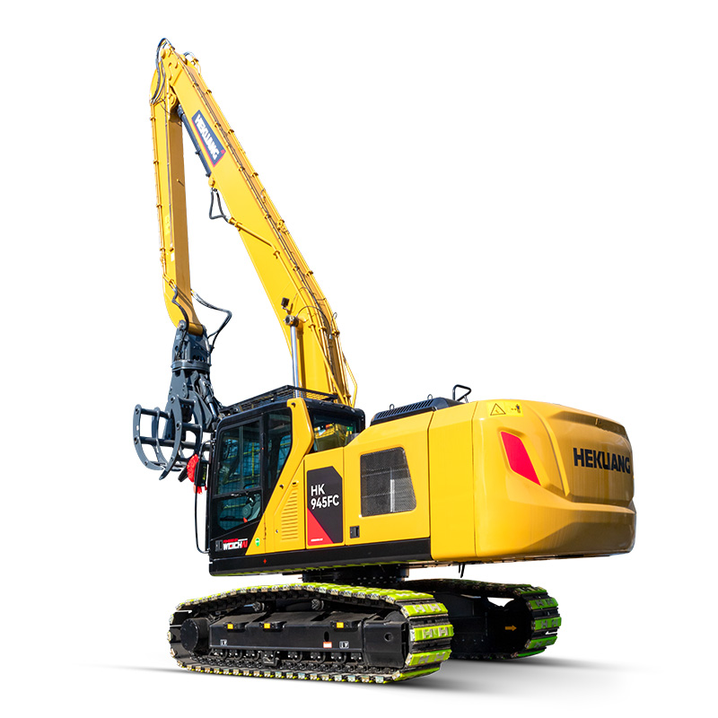 HK945FC抓木機的機身經過特別強化處理,具備超高的結構強度和耐用性。其底盤設計超長輪距,配備了8個支重輪,確保了作業過程中的穩定性和可靠性。抓斗、斗桿和動臂等關鍵部位采用了高強板和耐磨板,以及大截面結構設計,全面提升了整體強度和剛度,延長了使用壽命。