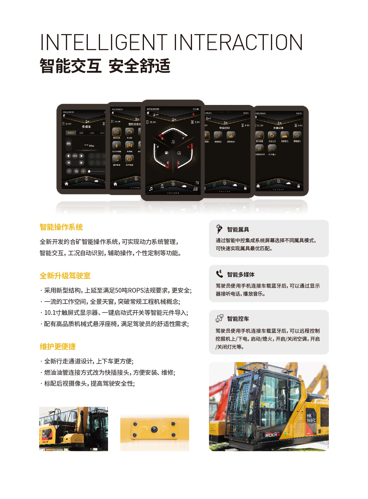為了方便用戶進行維護和保養,HK945FC在設計上充分考慮了便捷性。全新行走通道設計使得上下車更為方便;燃油油管連接方式改為快插接頭,便于安裝和維修;標配后視攝像頭則提高了駕駛的安全性。