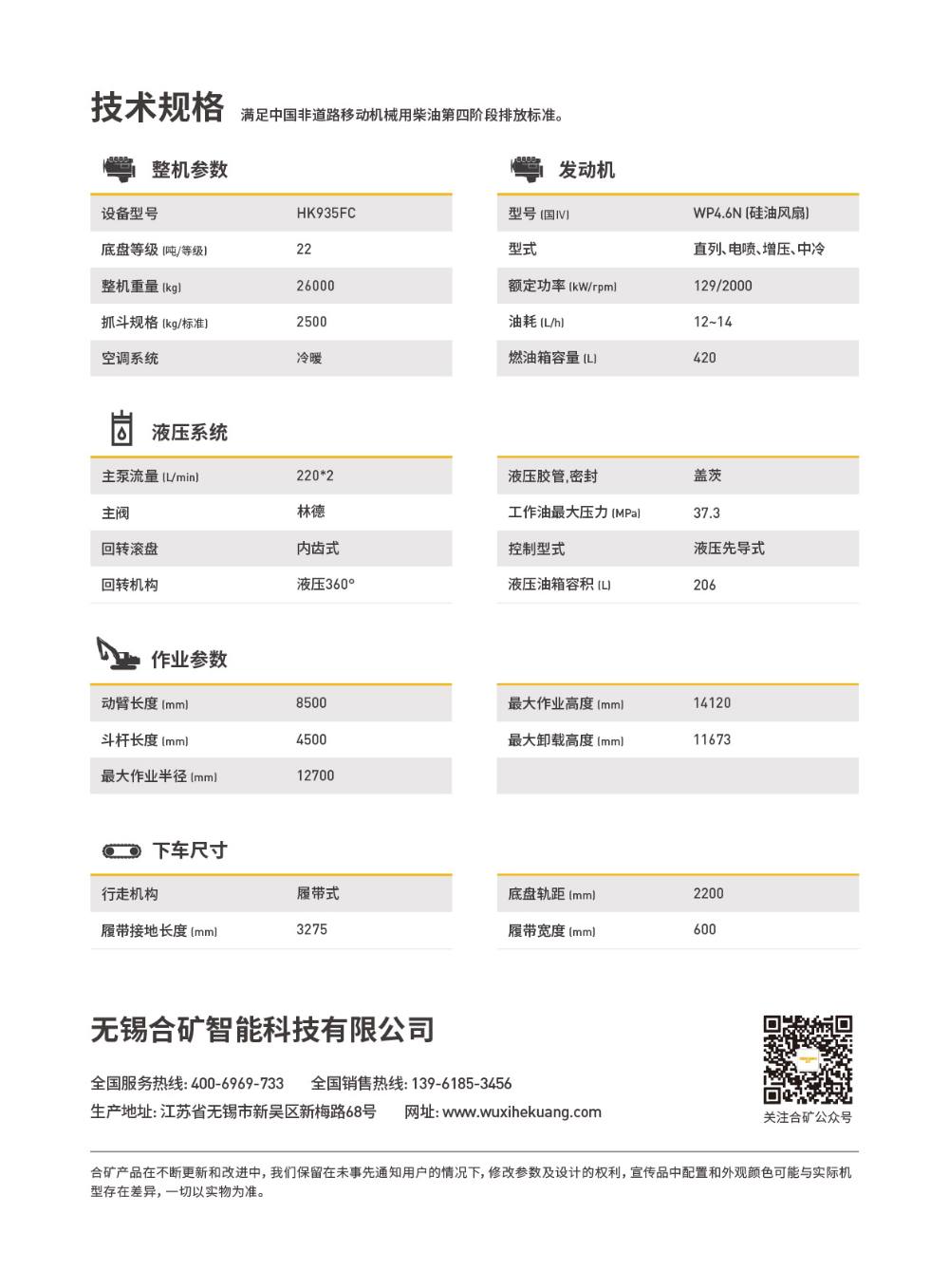 HK935FC搭載了合礦定制的濰柴 WP4.6N 低轉速大扭矩發動機,熱效率在行業中處于領先地位。該發動機不僅提升了整機的作業效率達10%,還使燃油效率提高了15%,有效降低了能耗。配合優化的液壓系統,整機在作業過程中展現出更加節能的表現。