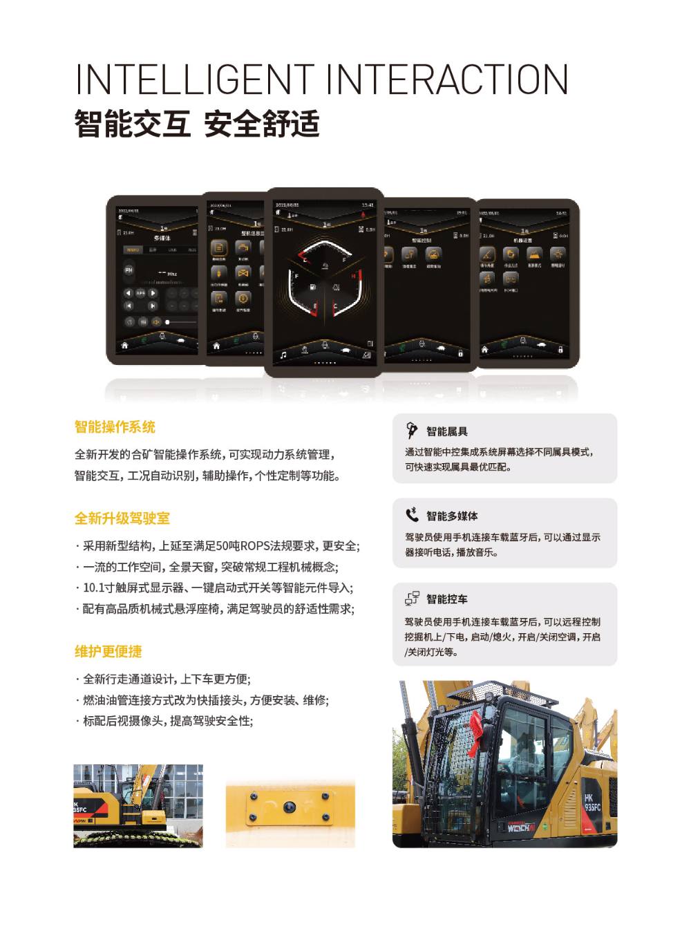 全新開發的合礦智能操作系統為HK935FC帶來了前所未有的智能體驗。該系統可實現動力系統管理、智能交互、工況自動識別、輔助操作、個性定制等功能。駕駛員可以通過手機連接車載藍牙,遠程控制挖掘機上/下電、啟動/熄火、開啟/關閉空調和燈光等。同時,智能多媒體功能允許駕駛員在顯示器上接聽電話、播放音樂,大大提升了作業的舒適性和便捷性。