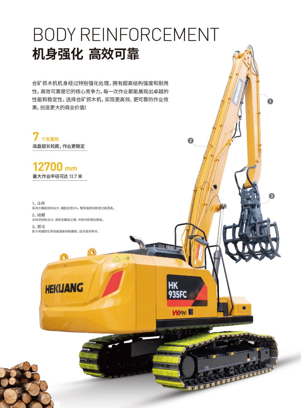 HK935FC抓木機的機身經過特別強化處理,具有超高結構強度和耐用性。機身采用7個支重輪,底盤超長輪距設計,使作業更加穩定。同時,抓斗關鍵部位采用高強板和耐磨板,延長了使用壽命。動臂和斗桿的設計也經過精心優化,動臂采用多段式結構設計,尾部變截面過渡,中段內部增加筋板;斗桿采用大截面結構設計,截面加寬8%,整體強度和剛度全面提高。